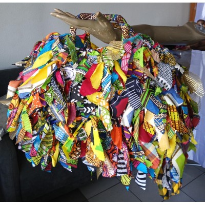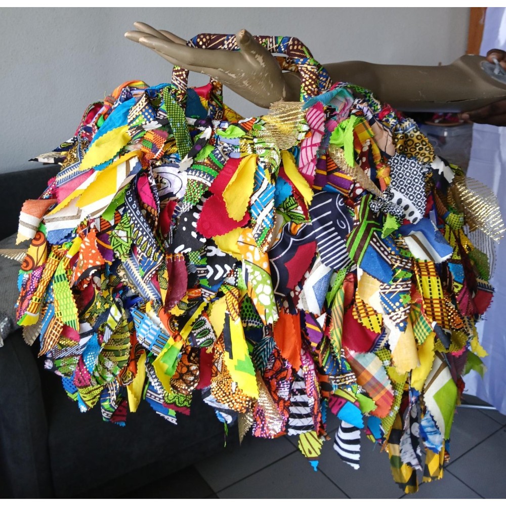 Panier en plastique recouvert de petits morceaux de tissus multicolores en coton, wax, madras, organsia.Utilisation de chutes de tissus.